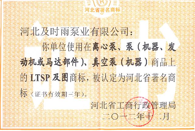 及時雨品牌被評為河北省商標-河北及時雨泵業有限公司